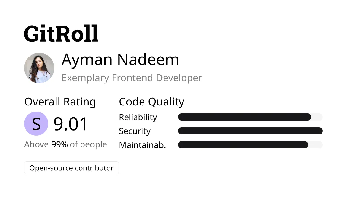 How is Ayman’s GitRoll: An exceptional frontend developer. With a 9.01 rating, she is in the top 1%. She codes logically, reliably, and securely. Her code is clean and maintainable. Ayman is recognized in the open-source community and drives technological advancements.