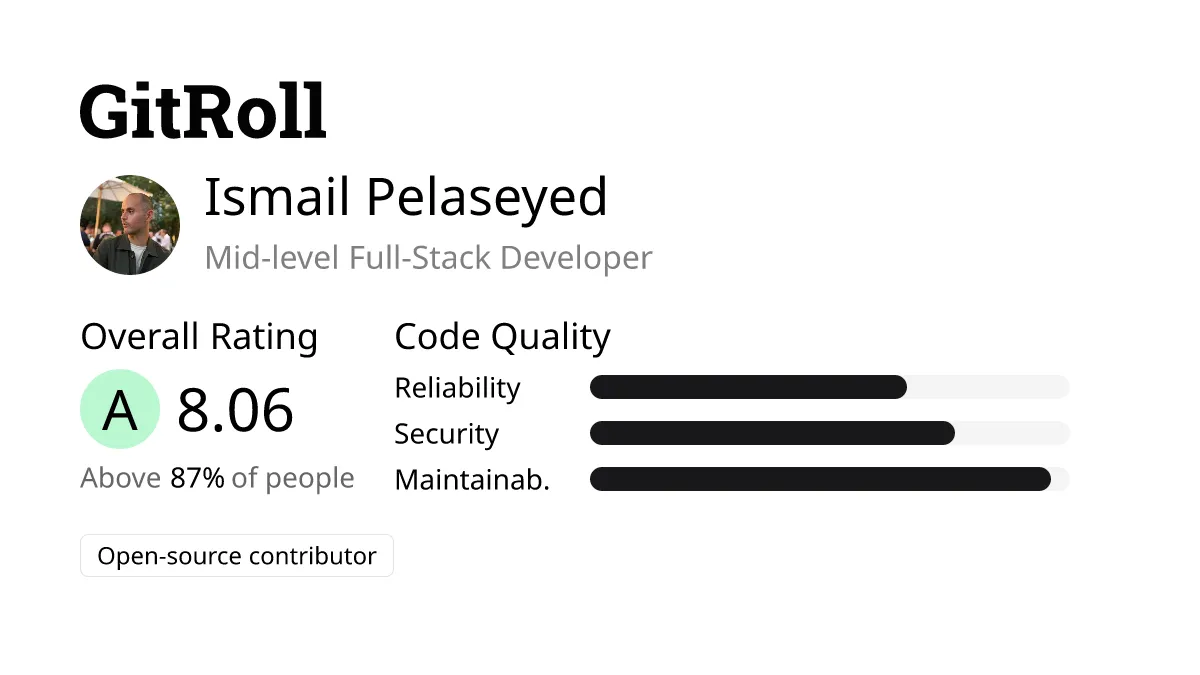 How is Ismail’s GitRoll: A mid-level full-stack developer from Sweden, ranked in the top 13%. He’s an active open-source contributor with 12 years on GitHub and 1720 followers. He writes clean, maintainable code, but might have logical and security issues. Despite this, he has contributed to important projects and is influential in advancing technology.