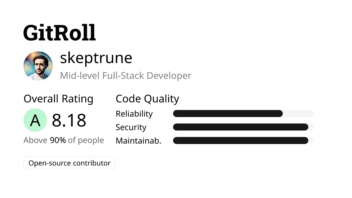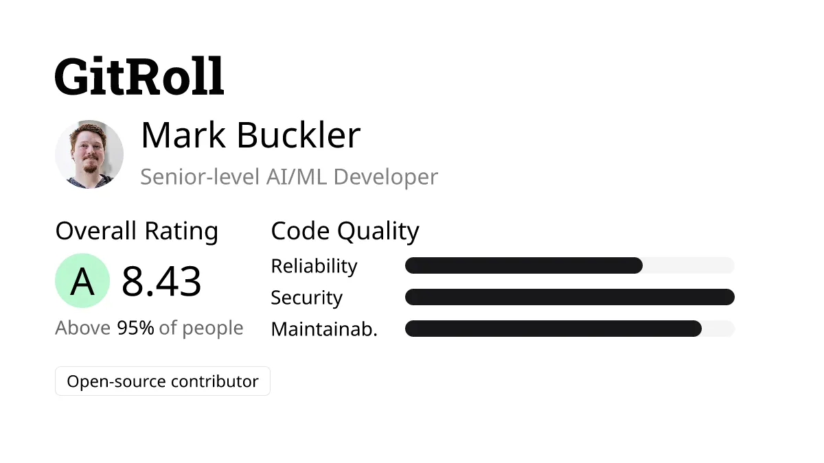 How is Robin’s GitRoll: A mid-level AI/ML developer, ranks in the top 15% of his field with an A (8.00) rating. Noteworthy attributes include his reliable, secure, clean code following best practices. His clear, maintainable code combined with active contributions to open-source projects demonstrate his moderate influence in the community.