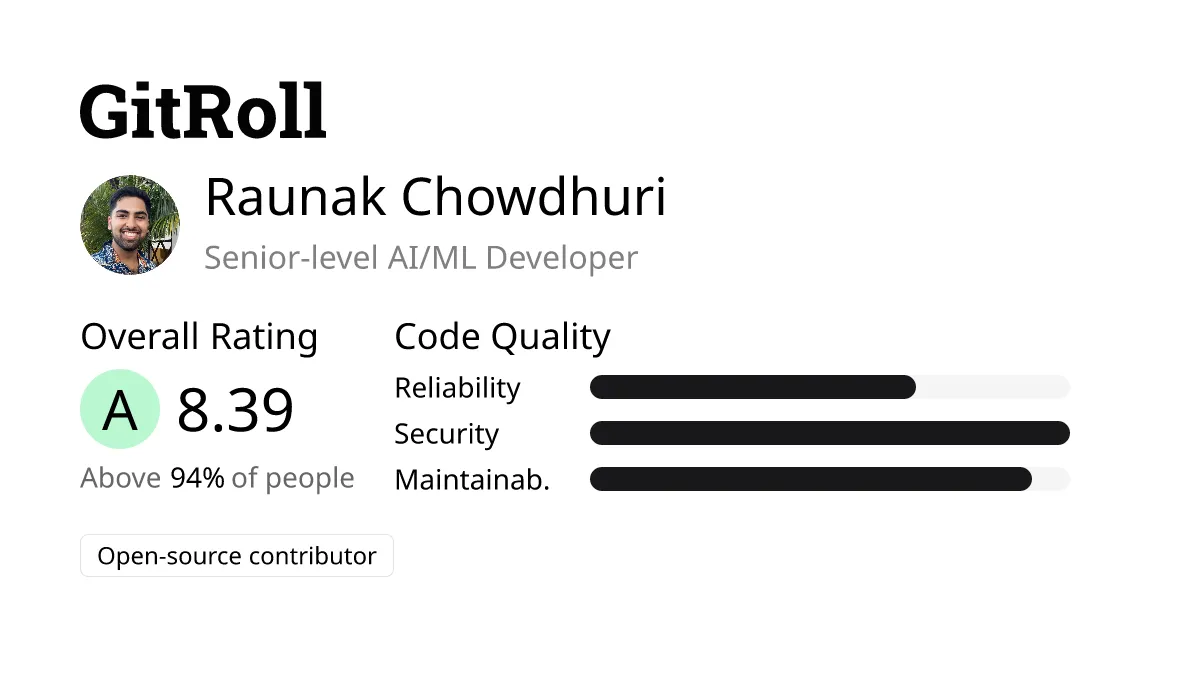 How is Raunak’s GitRoll: A senior AI/ML developer ranks top 6% with a rating of 8.39. He has 9 years of GitHub experience and 57 followers. He writes secure, clean code, and contributes to significant projects, but may have minor logical errors.