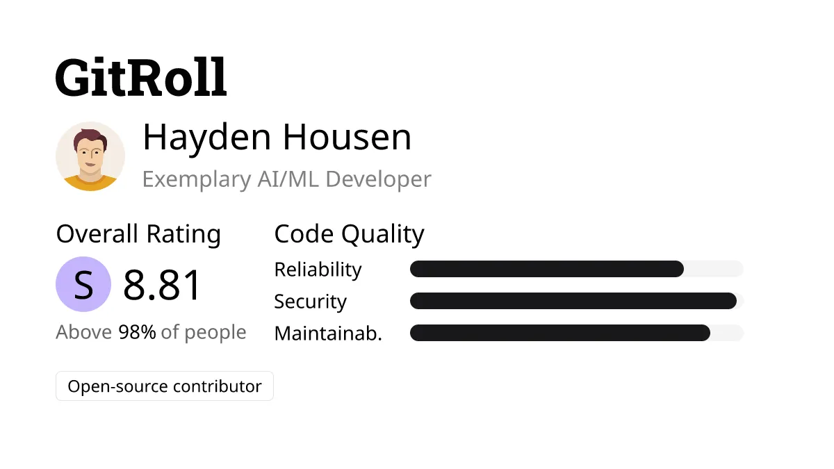 How is Hayden’s GitRoll: An AI/ML developer ranks in the top 2% with a rating of 8.81. Expertise in machine learning, NLP, Python, PyTorch, and cybersecurity. Has 9 years of experience on GitHub and 114 followers. Significant contributions include work on unsupervised object discovery, paraphrase identification, and automatic lecture summarization. Developed a widely used text summarization system and authored cybersecurity guides. Pursues cross country running and skiing. Actively involved in NLP, Computer Vision, Deep Learning, and machine learning algorithms, and participates in cybersecurity competitions.