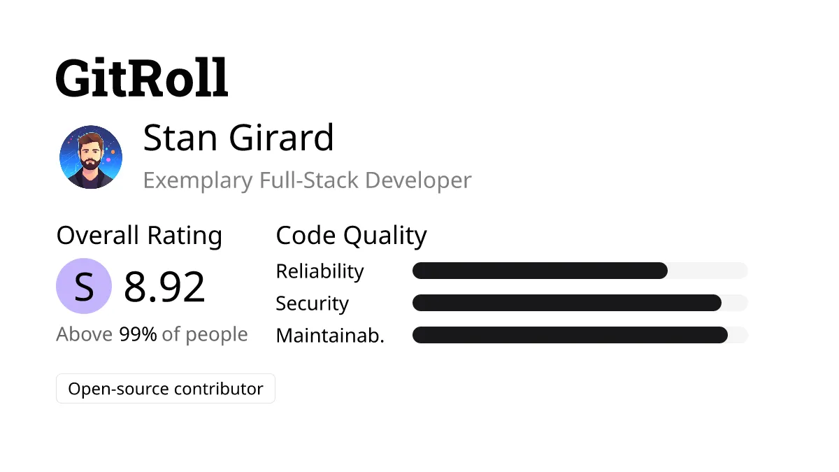 How is Stan’s GitRoll: An exceptional full-stack developer respected in the open-source community. Stan excels in writing reliable, secure, and clean code, adhering to best security practices, and producing maintainable code. He’s recognized for significant contributions to key projects and technological advancements.