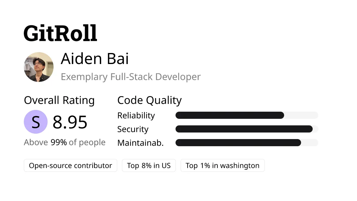 How is Aiden’s GitRoll: An acclaimed full-stack developer, Bai ranks in the top 2% on GitHub and top 1% at the University of Washington. Known for secure, reliable code, he has over 6 years of open-source contributions. His notable projects include Million.js, which enhances React’s speed by 70%, Lucia.js, a 3kb JavaScript library, and KBowl, an online platform serving 30+ schools and 1k+ students.